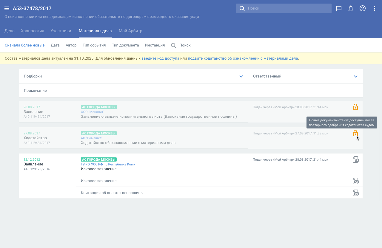 Все материалы дела (МД) отображаются на вкладке Материалы дела (если у пользователя есть доступ). Доступ к МД осуществляется через ввод кода доступа или подачу Ходатайства об ознакомлении с МД.
